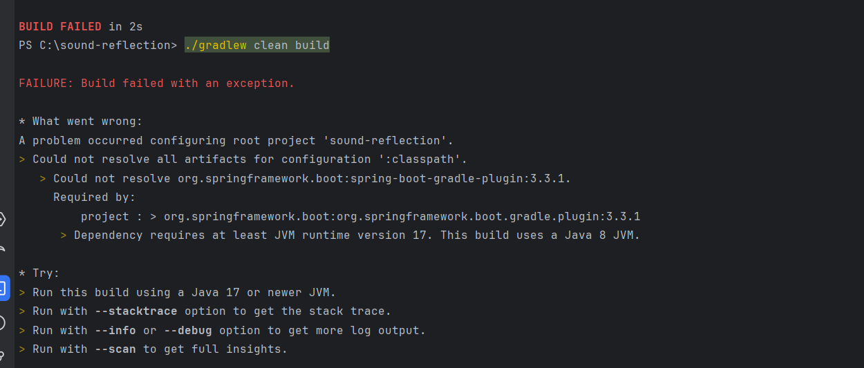 해당 문제는 Java 17 이상의 JVM이 필요한데, Java 8 JVM을 사용하고 있어서 발생한 문제입니다.