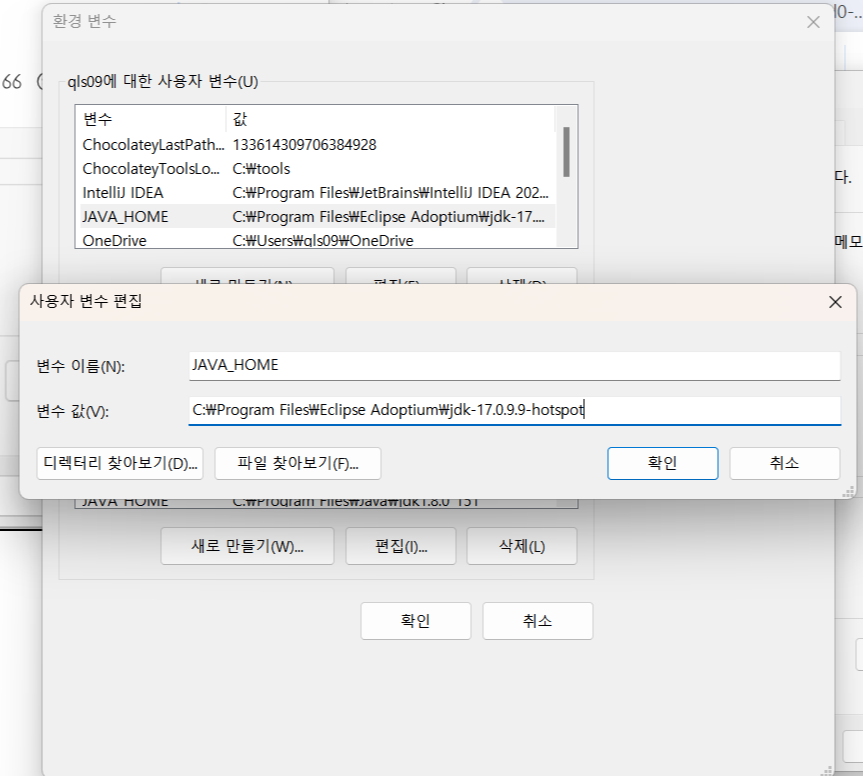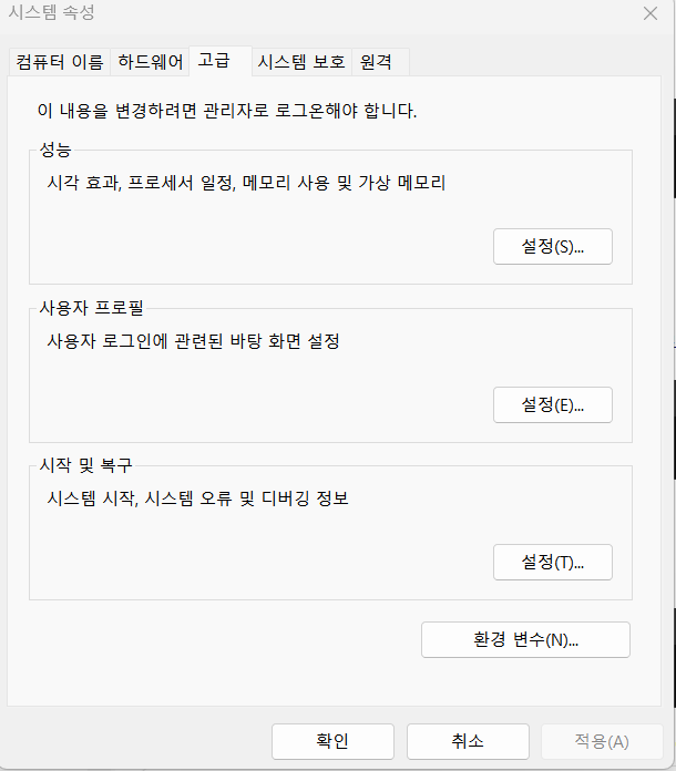 윈도우 기준 고급 시스템 설정에 들어가서, 환경변수를 눌러줍니다.