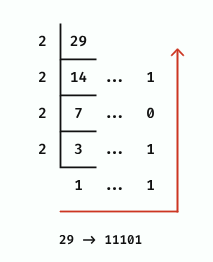 1. 10진수를 2로 나누고 나머지를 배열에 기록합니다. (29 / 2 -> 14 / 2 -> 7 / 2... )