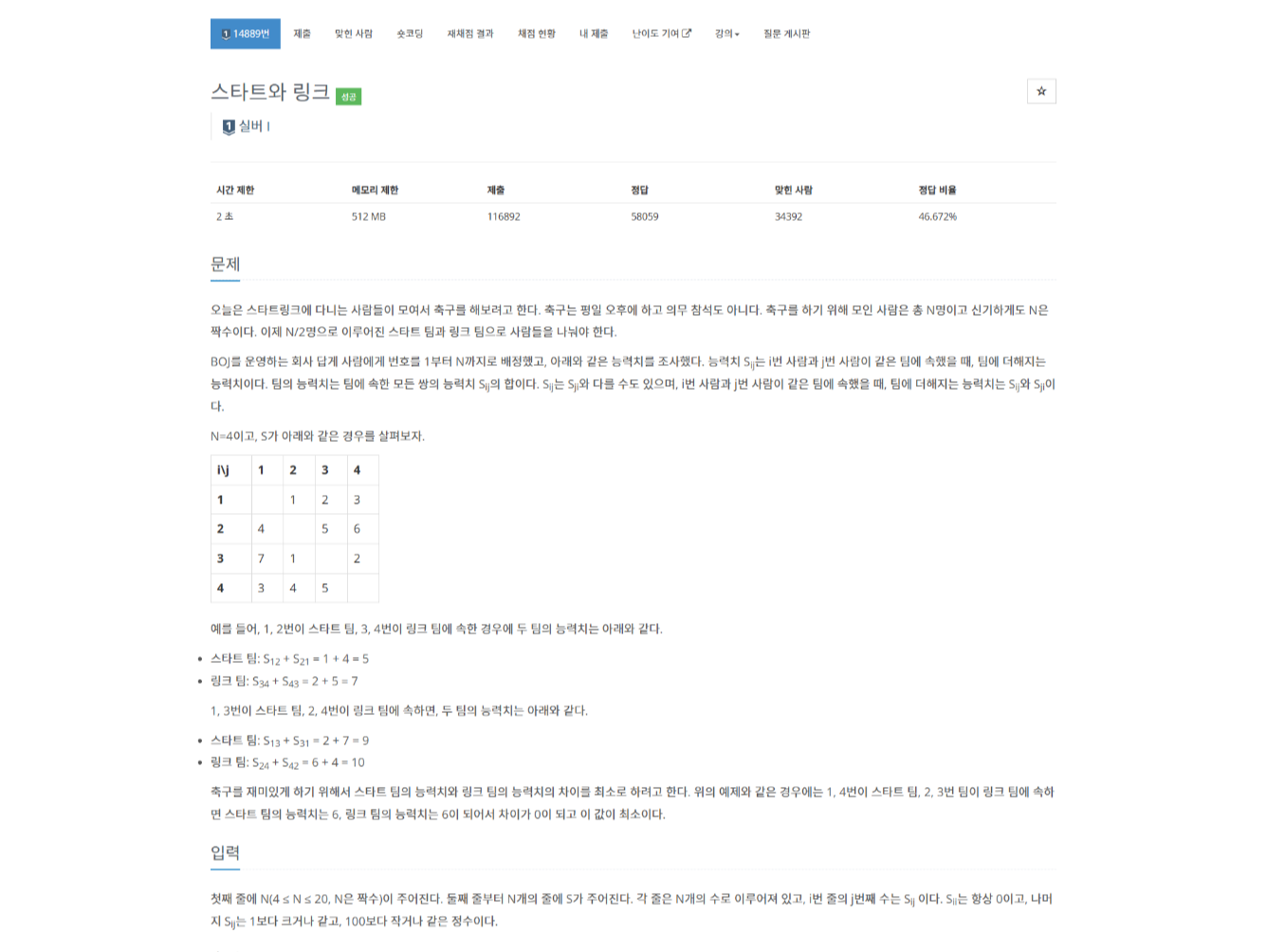 - 0번 사람을 무조건 start팀에 포함시켜 중복 조합을 줄이는 게 핵심입니다.