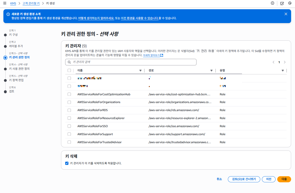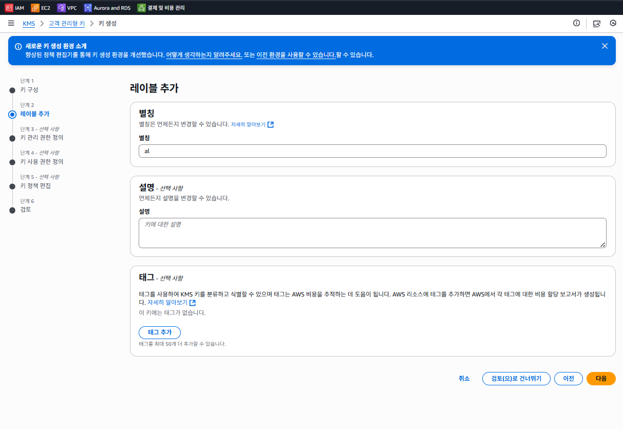 2. 키 구성, 레이블 추가, 키 관리 권한 정의, 키 사용 권한 정