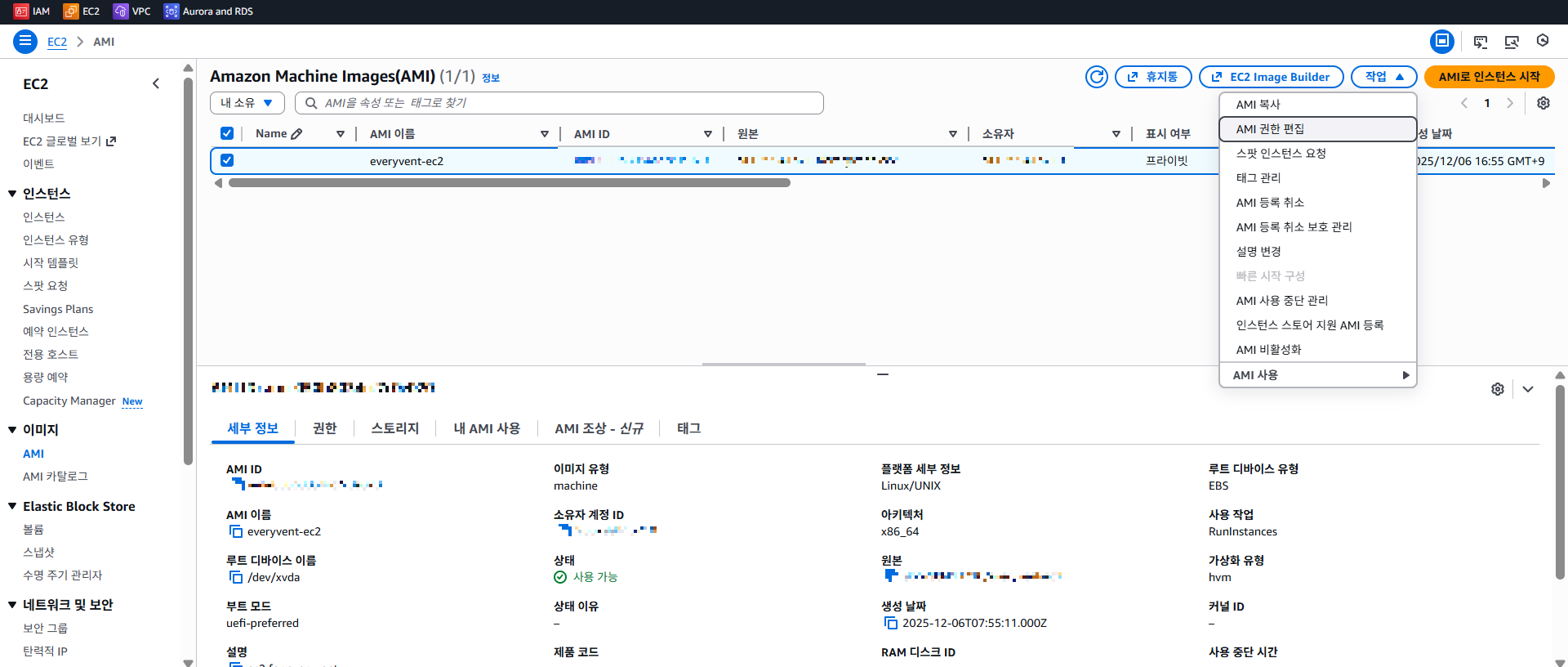 3. EC2 > 이미지 > AMI > 원하는 AMI 클릭 > 작업 > AMI 권한 편집
