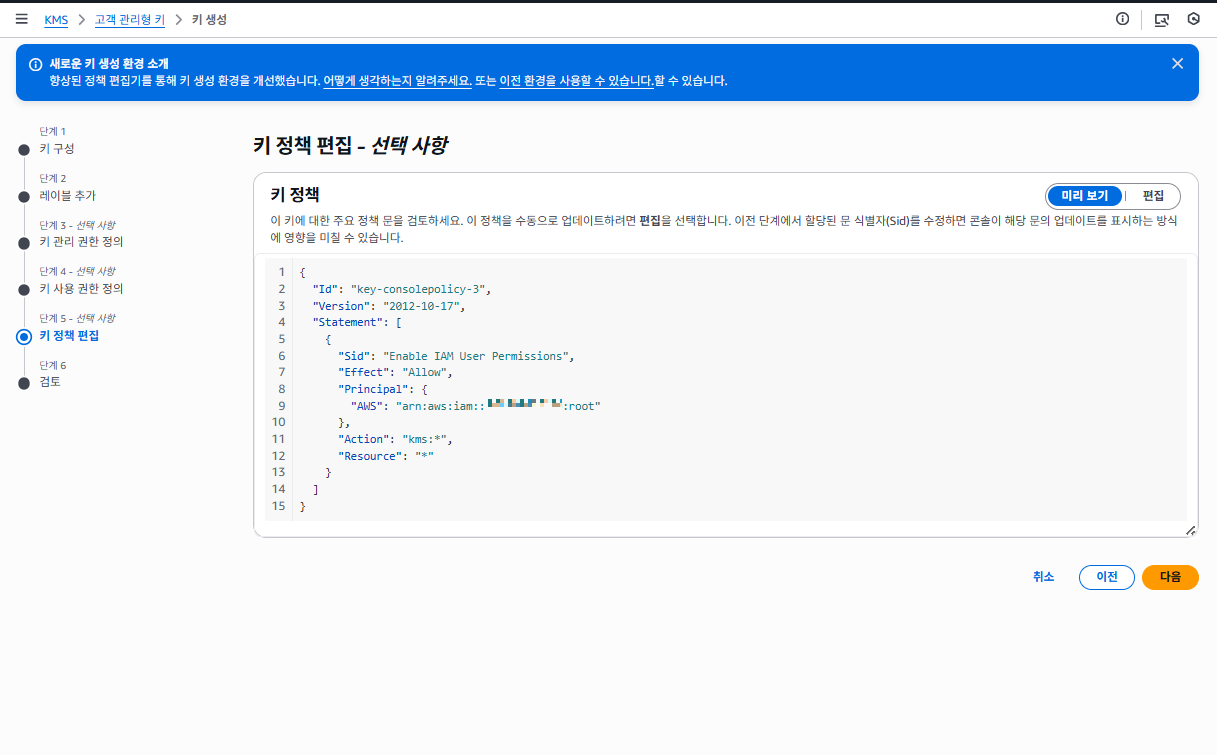 1. KMS > 고객 관리형 키 > 오른쪽 상단 키 생성