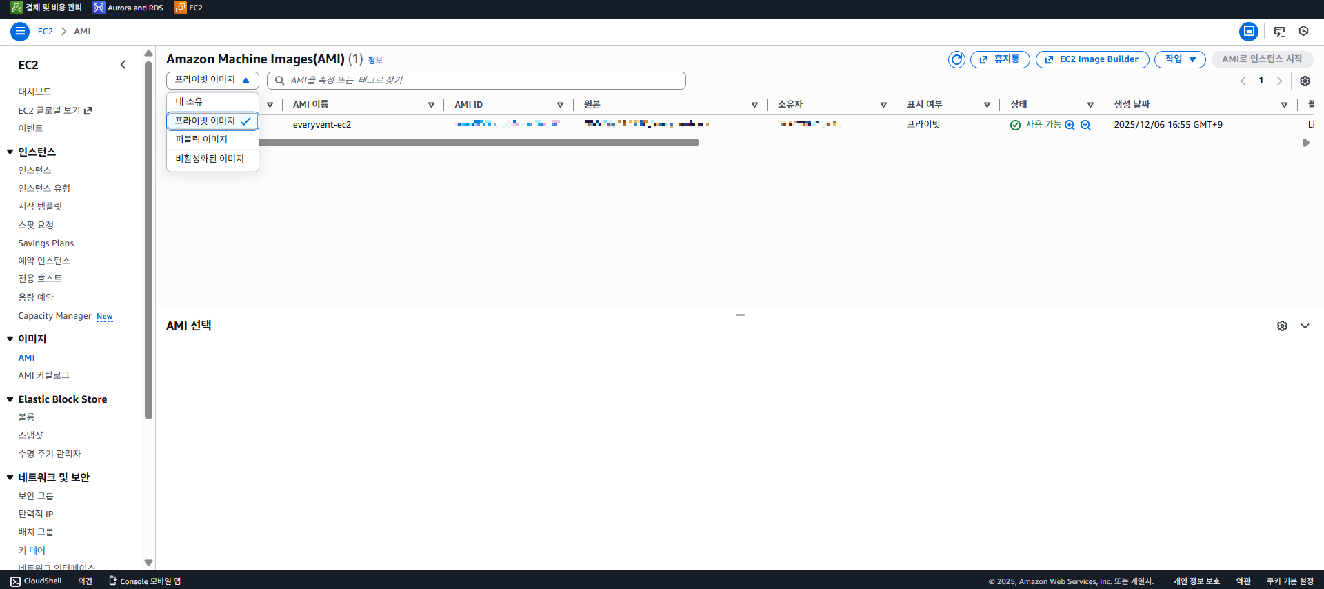 1. 새 계정 > EC2 > AMI > 왼쪽 상당 프라이빗 이미지 > AMI로 인스턴스 시작