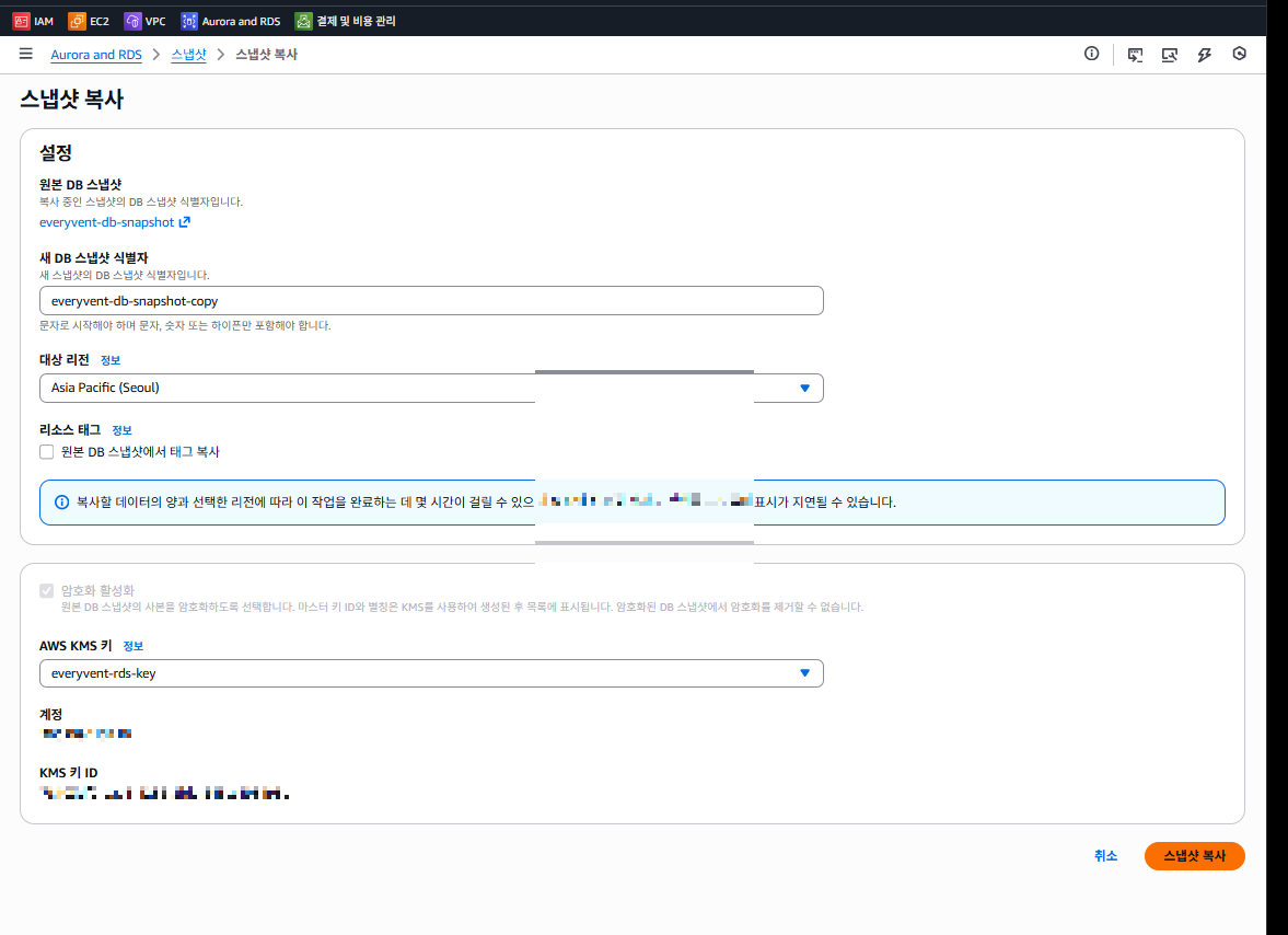 5. 생성한 스냅샷 복사 (원하는 계정과 공유하는 KMS 키를 사용하기 위해)