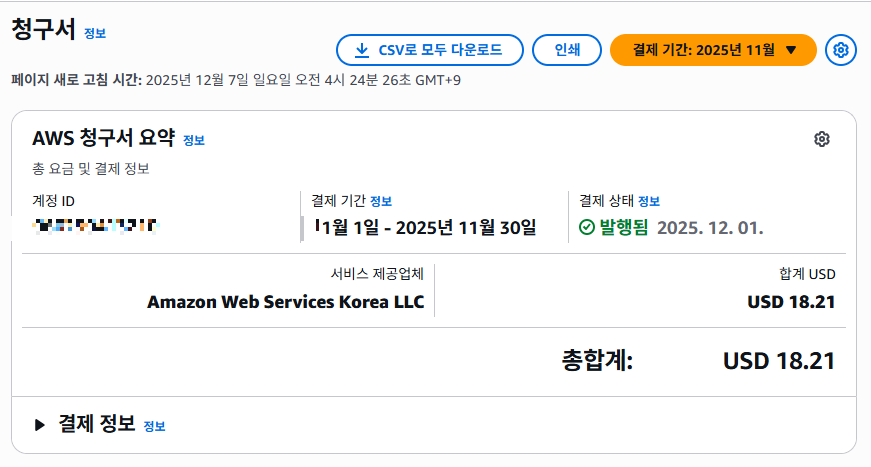 11월 20일에 첫 배포를 하고 약 10일 동안 사용하였는데 12월이 되었을 때 aws에서 돈이 나간 것을 확인했습니다...!