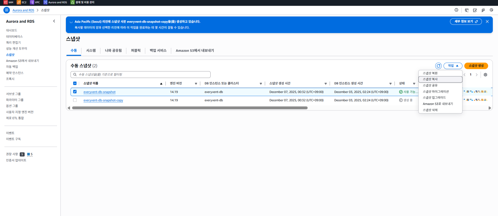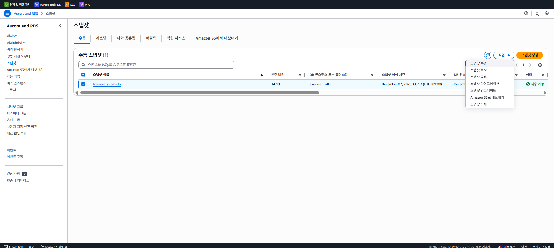 2. RDS > 스냅샷 > 수동 > 스냅샷 복원